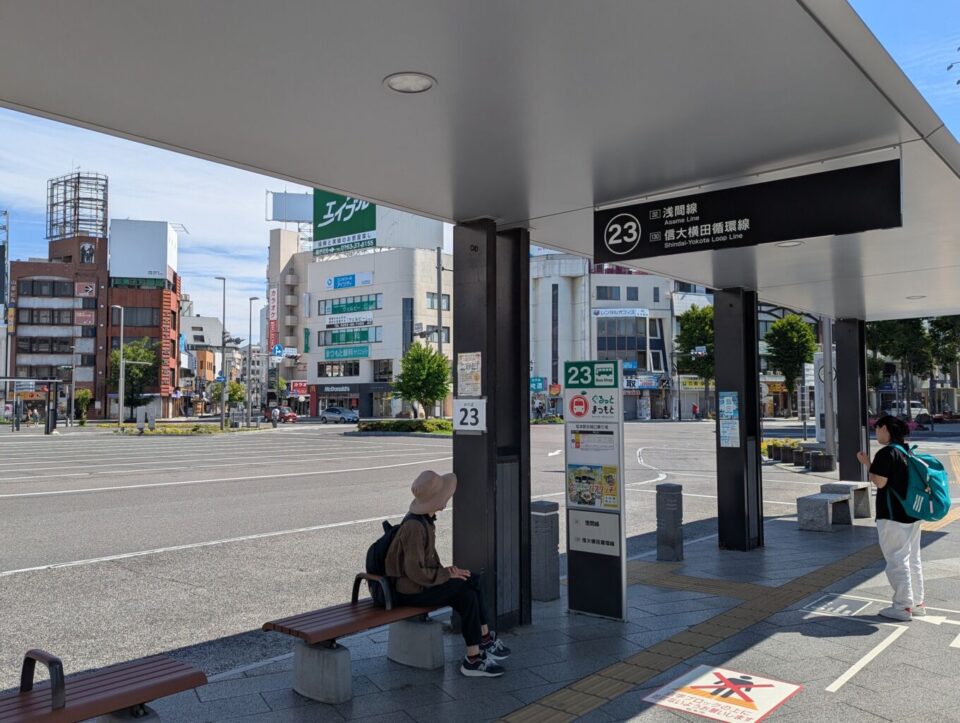 Descendez à l'arrêt de bus « Shita-Asama Hiroba ». Le Lawson est situé tout juste à côté.