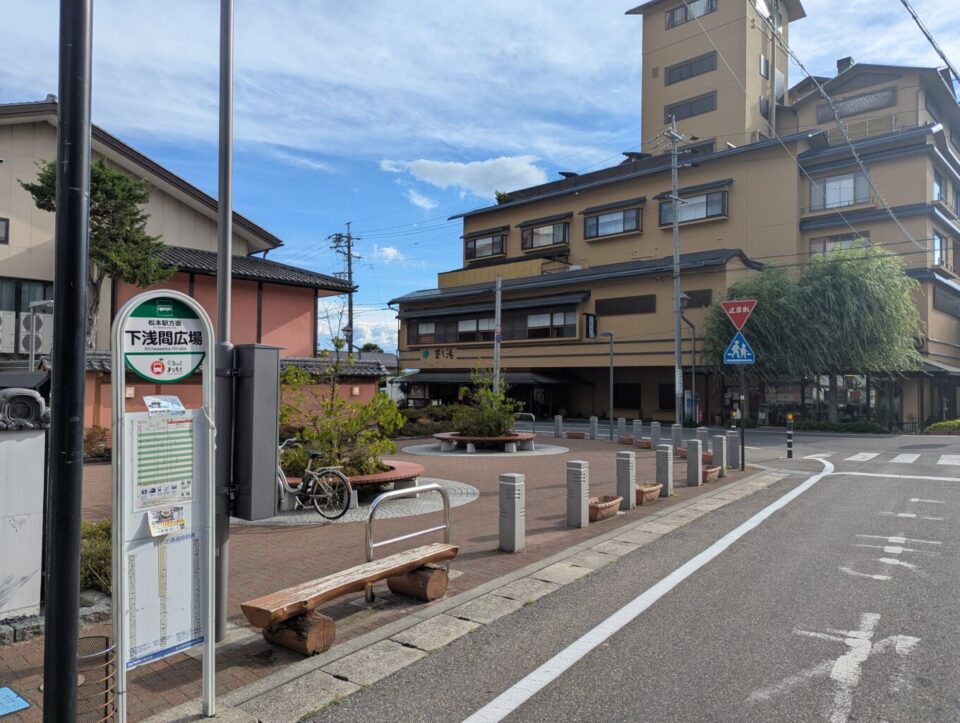 Depuis la gare de Matsumoto (Sortie du Château), prenez la ligne Asama (浅間線) – « Bus Stop No.23 » / « Ligne de bus No.32 », à destination d'Asama Onsen. Les bus circulent environ toutes les 30 à 60 minutes et le trajet dure environ 20 à 25 minutes.